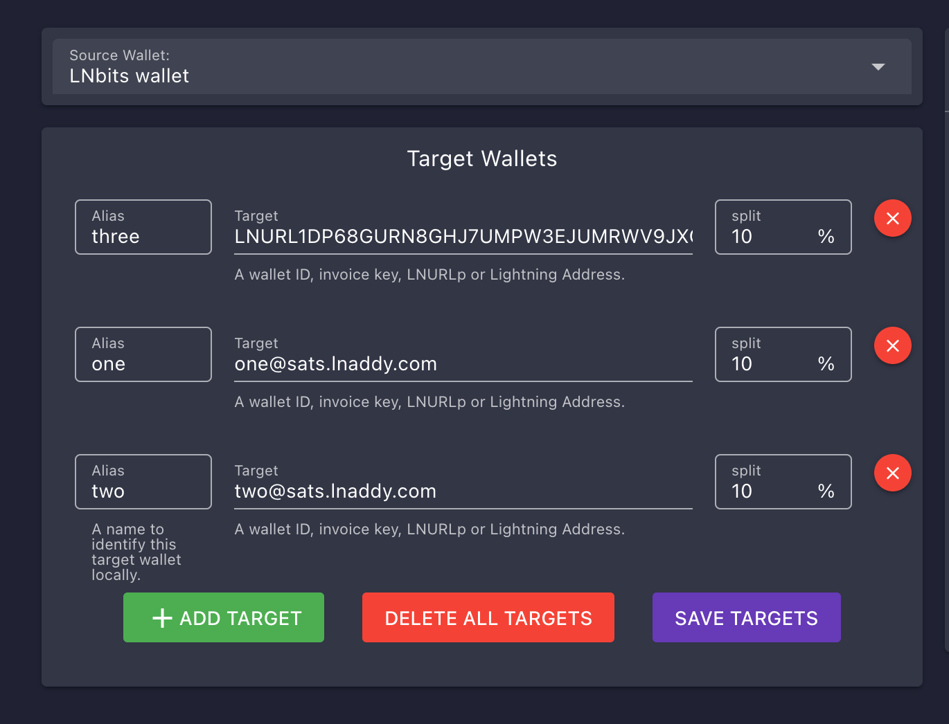 Depending on your needs, the target wallets can either be internal to the current LNBits instance by using just the Wallet ID or external using Lightning addresses, such as one@sats.lnaddy.com or LNURL.