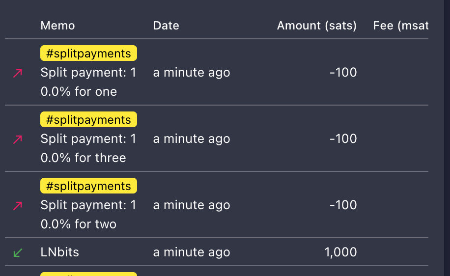 Once all the targets have been saved, test your splits by sending to the main wallet, either by creating an invoice or sending to the lightning address associated with the main wallet.